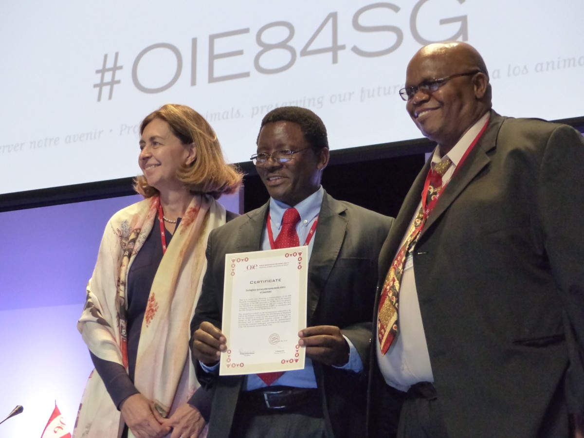 The OIE Delegate of Swaziland, Dr Roland Dlamini (middle) receives the certificate of recognition of country free from contagious bovine pleuropneumonia (CBPP). Picture © P. Bastiaensen (oie) 2016.