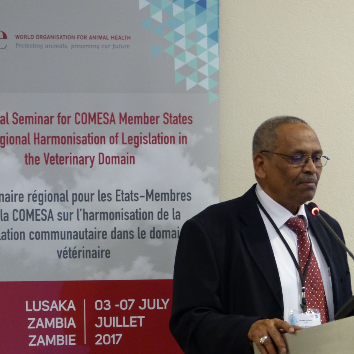 The seminar was further attended by speakers and observers from the Food and Agriculture Organization of the United Nations (FAO), the Executive Secretariat of the Common Market for Eastern and Southern Africa (COMESA), the Inter-African Bureau of Animal Resources of the African Union (AU-IBAR) and a team of six OIE trainers, including the two key experts from the OIE Veterinary Legislation Support Programme (VLSP), David Sherman, OIE VLSP Coordinator and Martial Petitclerc, OIE / VLSP legal expert for the francophone countries.