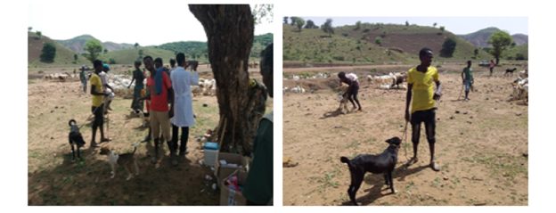 Figure 3: Dogs being vaccinated against rabies while Sheep and Goats are vaccinated for PPR and SGP in Gash Barka. © Veterinary Services, Ministry of Agriculture of Eritrea, 2020