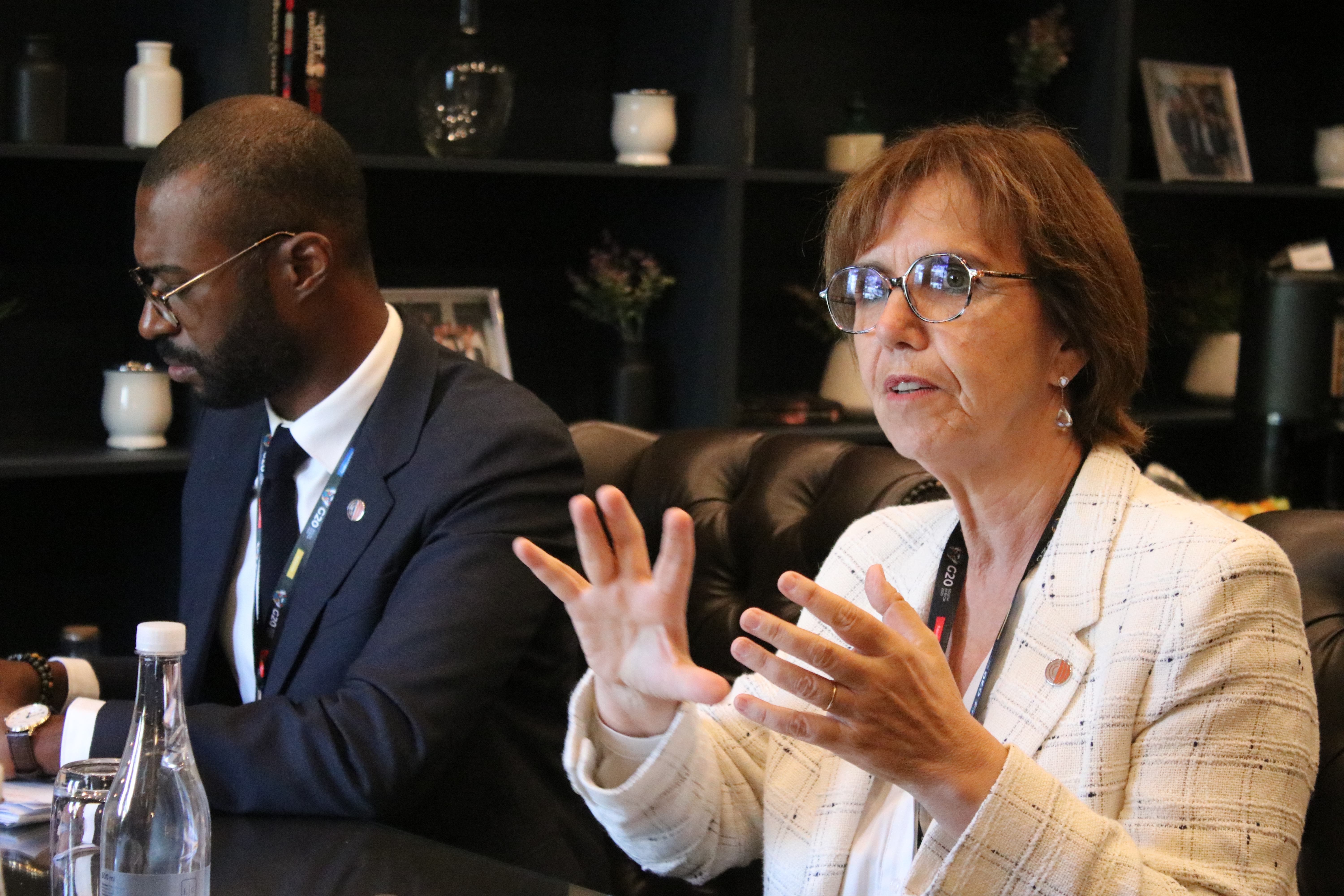 Dr Emmanuelle Soubeyran (right) during the bilateral meeting with the Minister of Agriculture, Land Reform and Rural Development (DALRRD), the Hon. Mr. John Steenhuisen. On the left is Mr. Pierre-Emmanuel Cangah, WOAH Chief of Staff. Picture (c) P. Bastiaensen (woah) 2025.
