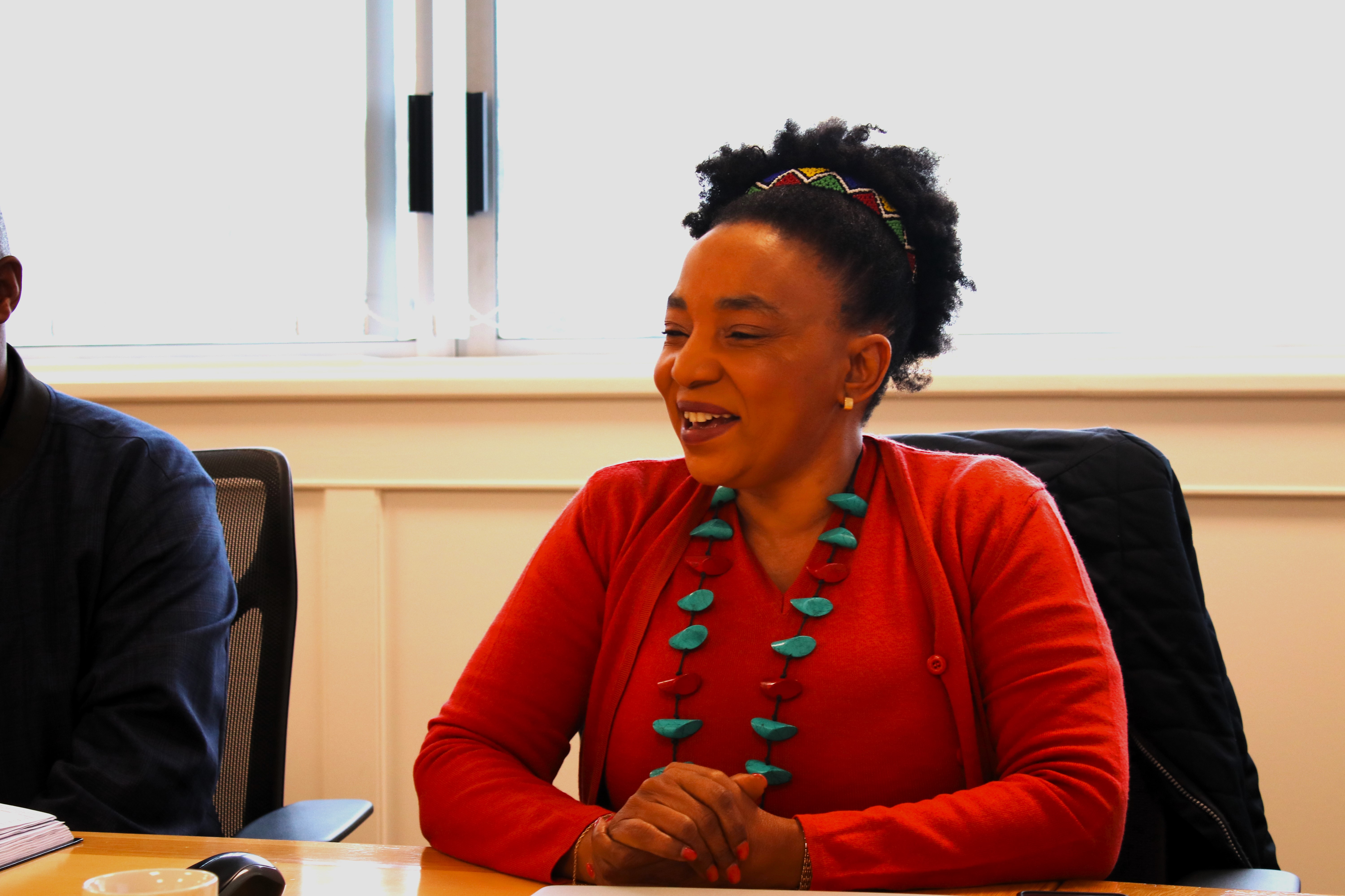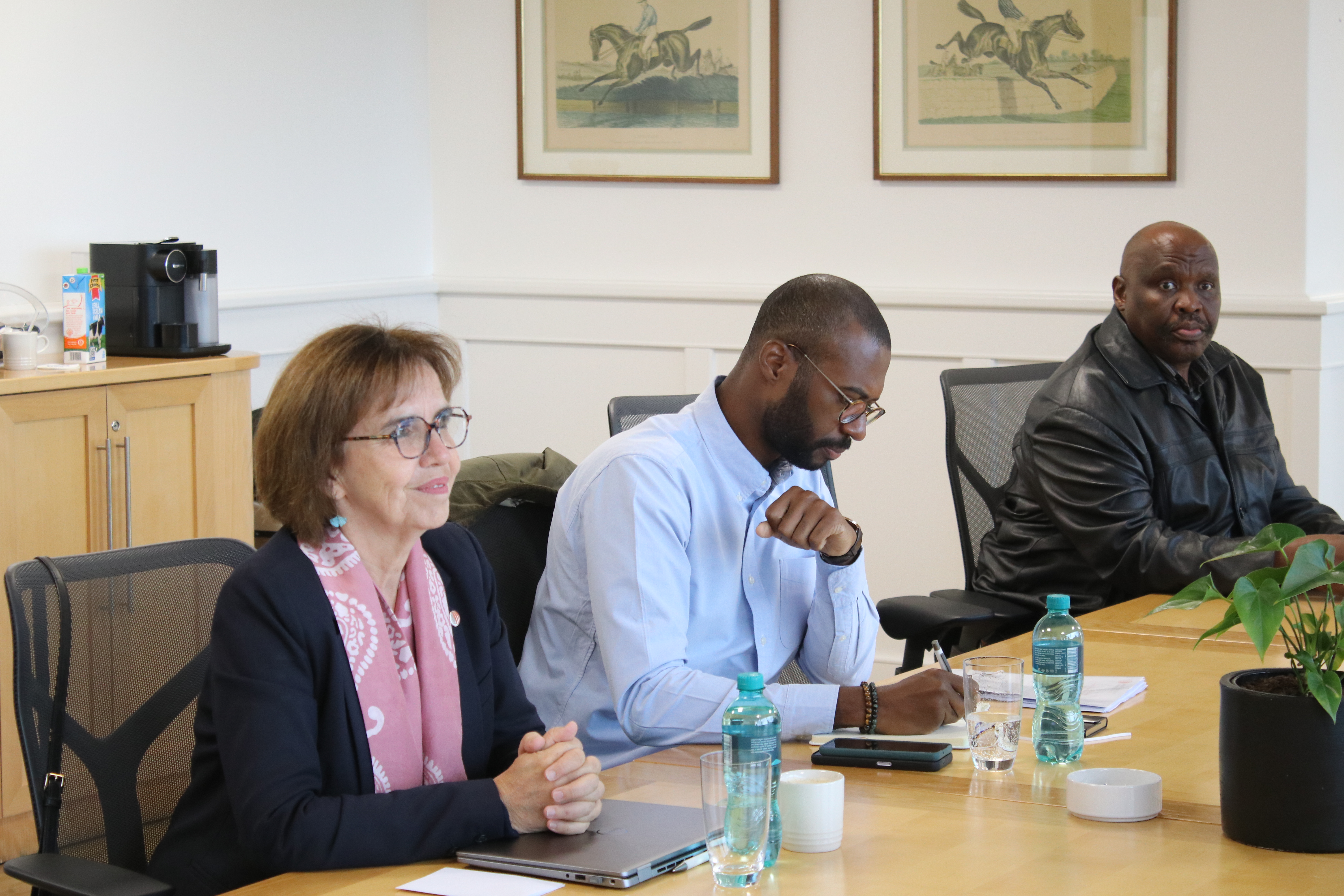In the boardroom of the Kenilworth equestrian facilities in Cape Town. Left to right : Dr Emmanuelle Soubeyran and Mr. Pierre - Emmanuel Cangah (WOAH) and Dr. Gininda Msiza, Chief Director Veterinary Services, Western Cape province. Picture (c) P. Bastiaensen (woah) 2025.