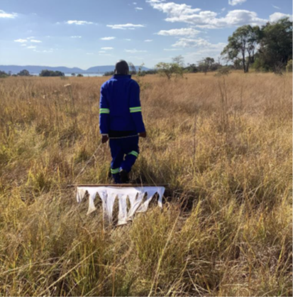 Personnel using the dragging method to collect ticks at Chivero National Park. Picture © DVS (ZW) 2022