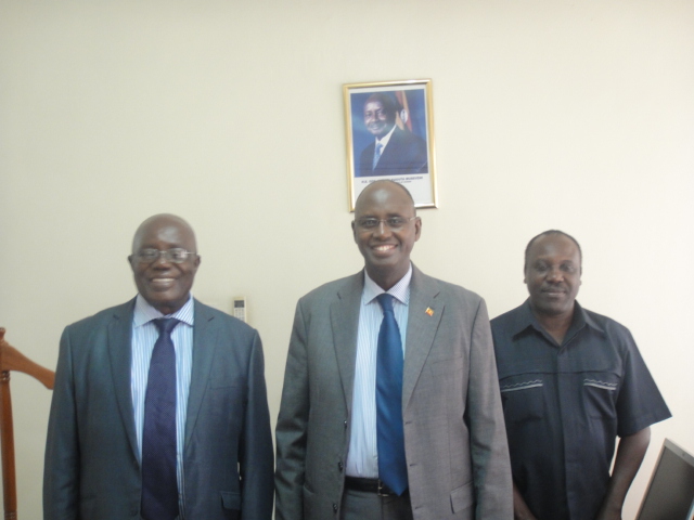 In the course of a two-day visit to Uganda, the OIE Sub-Regional Representative for Eastern Africa, Dr. Walter Masiga, was received by the Minister of Agriculture, Animal Industries and Fisheries (MAAIF), the Hon. Rwamirama K. Bright. Present were also Dr. Patrick Bastiaensen (OIE Programme Officer) and Dr. Nicholas Kauta, Director of Animal Resources (OIE Delegate).