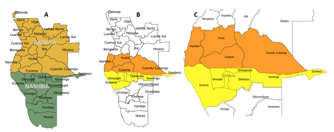Map showing Angola-Namibia cross-border rabies control areas (B and C: proposed pilot vaccination program area. Namibian side of the border had been implementing the rabies control activities since 2016).