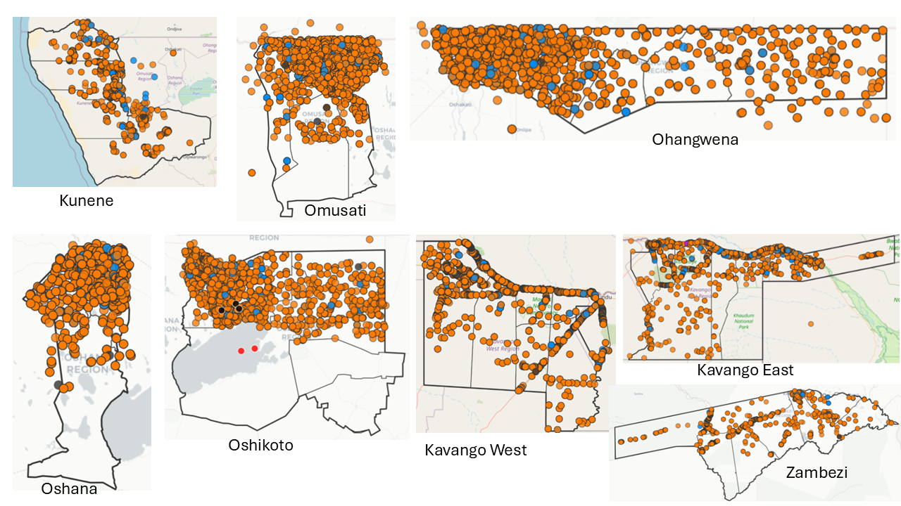 Figure 1. Rabies vaccination points across the Northern Communal Areas (NCA) in 2025, including additional vaccination points recorded south of the Veterinary Cordon Fence (SVCF). The map illustrates the extensive geographic reach of the 2025 campaign and highlights areas where mobile app–based data collection was used to track vaccination activities. (Orange dots indicate dog vaccinations, while blue dots indicate cat vaccinations)
