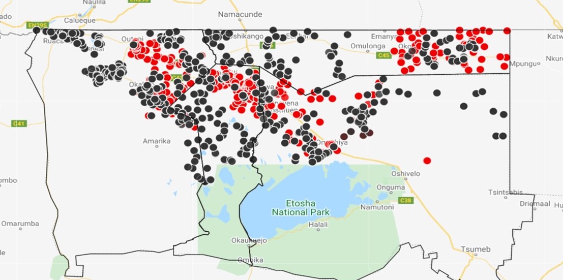 The locations of vaccinated animals in the rabies hot spot areas of the four regions of the Northern Communal Area (NCA) of Namibia. The black dots are the location of vaccinated animals during the ongoing 2020 campaign whilst the red dots are the vaccinated animals’ locations during the 2019 campaign.