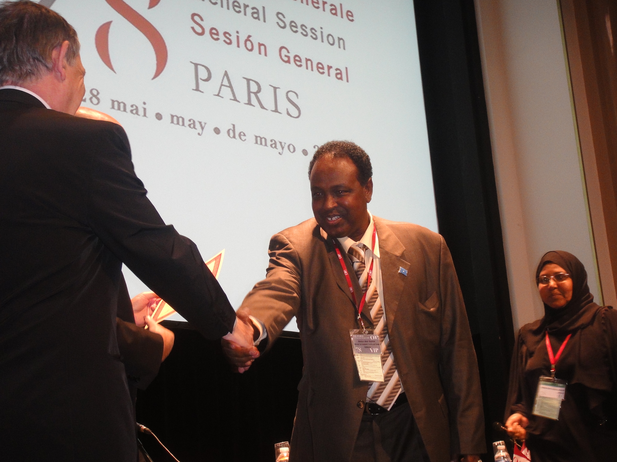 The Hon. Minister for Livestock, Forestry and Range of Somalia, M. Abukar Abdi Ossman, receiving the OIE official certificate of country freedom from rinderpest from Dr. Bernard Vallat, Director General. Picture (c) D. Mordzinski (oie) 2010.