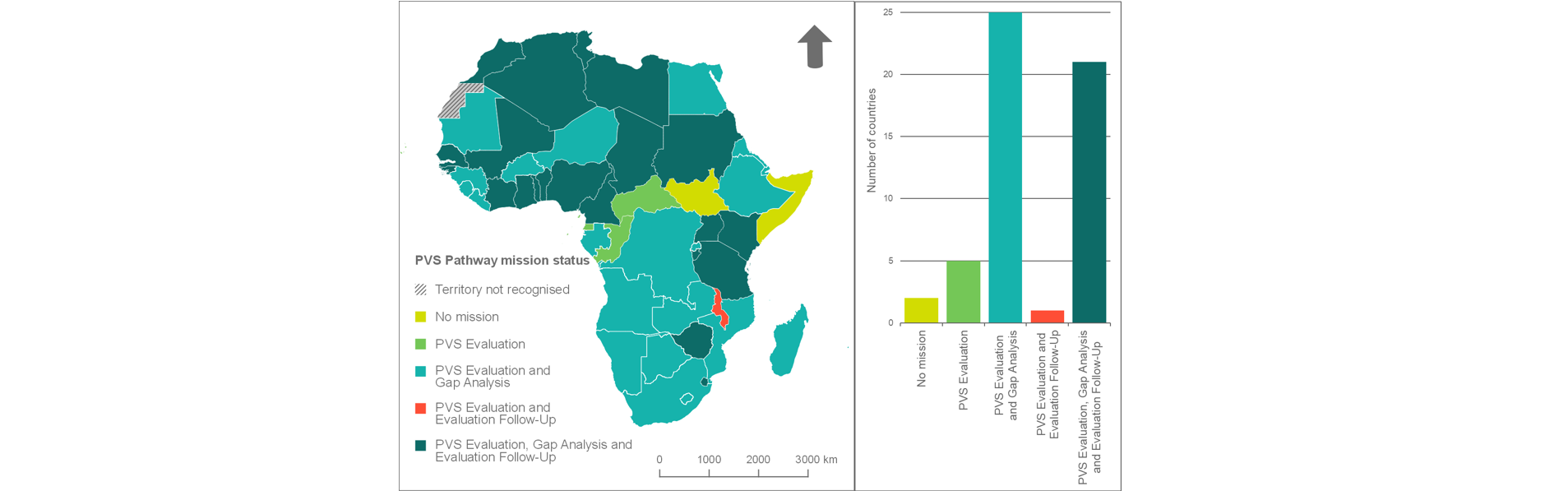 Figure 1: Map of countries (n=55) showing type and order of PVS Pathway missions carried out, and column chart displaying numbers of countries per category. Note that some island nations (e.g. Cape Verde, São Tome and Principe, Mauritius, Seychelles) are poorly visible due to the map scale.