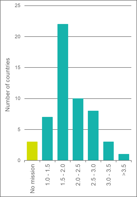 The national mean of these LoAs can be taken as a useful but somewhat crude statistic of the overall performance of the Veterinary Services. Figure 2 shows the distribution of the national means. It can be seen that 55% of countries had a mean LoA between level 1 and level 2, with only one country assessed as having a mean above level 3.5. This implies that generally, the Veterinary Services had very limited authority or capability to comply with international standards.