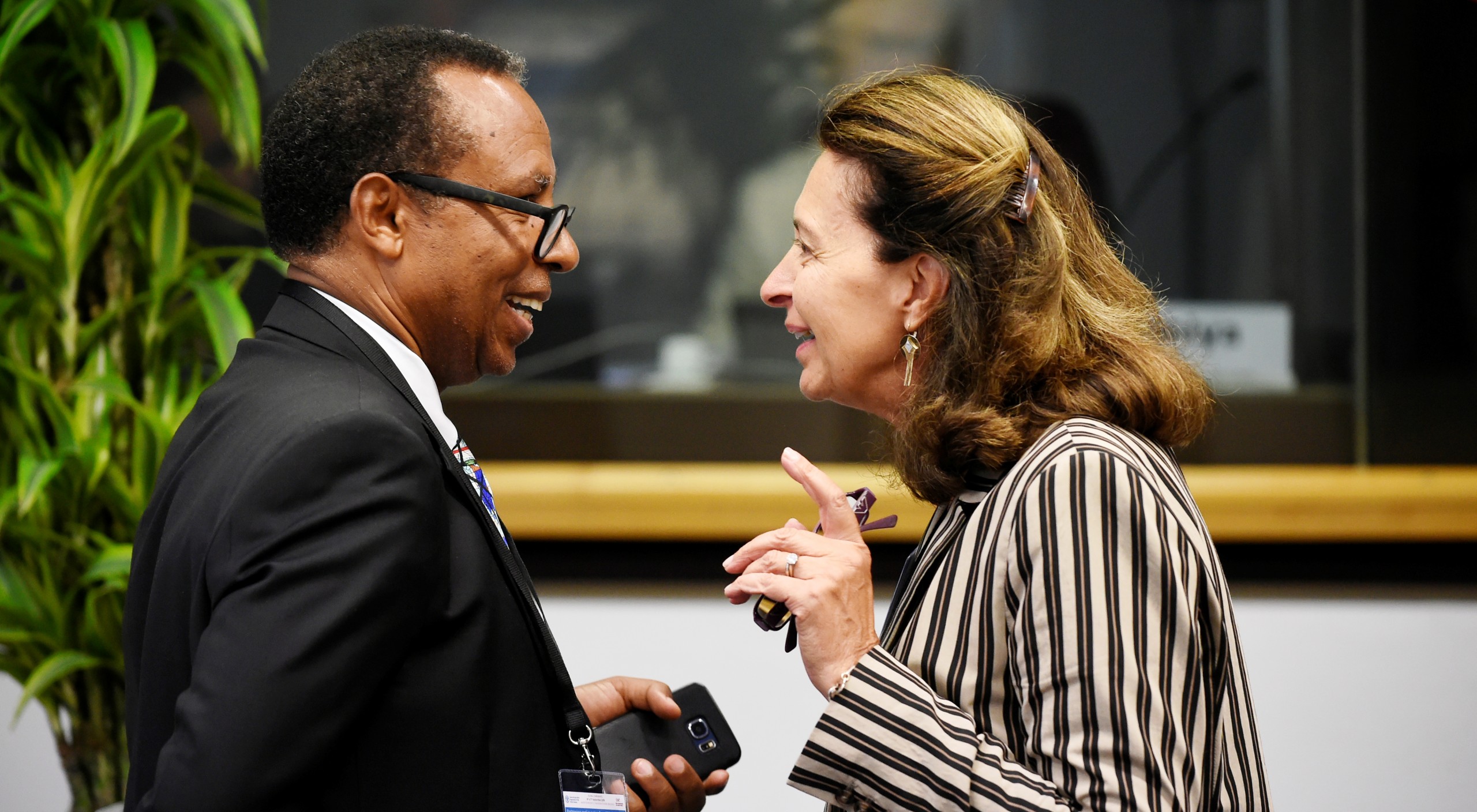 06 September 2018, Brussels, Belgium - Session 1: FAO representative Berhe Tekola, Director of the animal Production and Health Division (L) and OIE representative Monique Eliot, DG OIE (R) talk during Stakeholder Forum. FAO-OIE Global Conference: Partnering and investing for a peste des petits ruminants-free world. 6-7 September 2018 - Albert Borschette Conference Centre, Brussels, Belgium. PHOTO FAO/THYS JOHN PPR 2