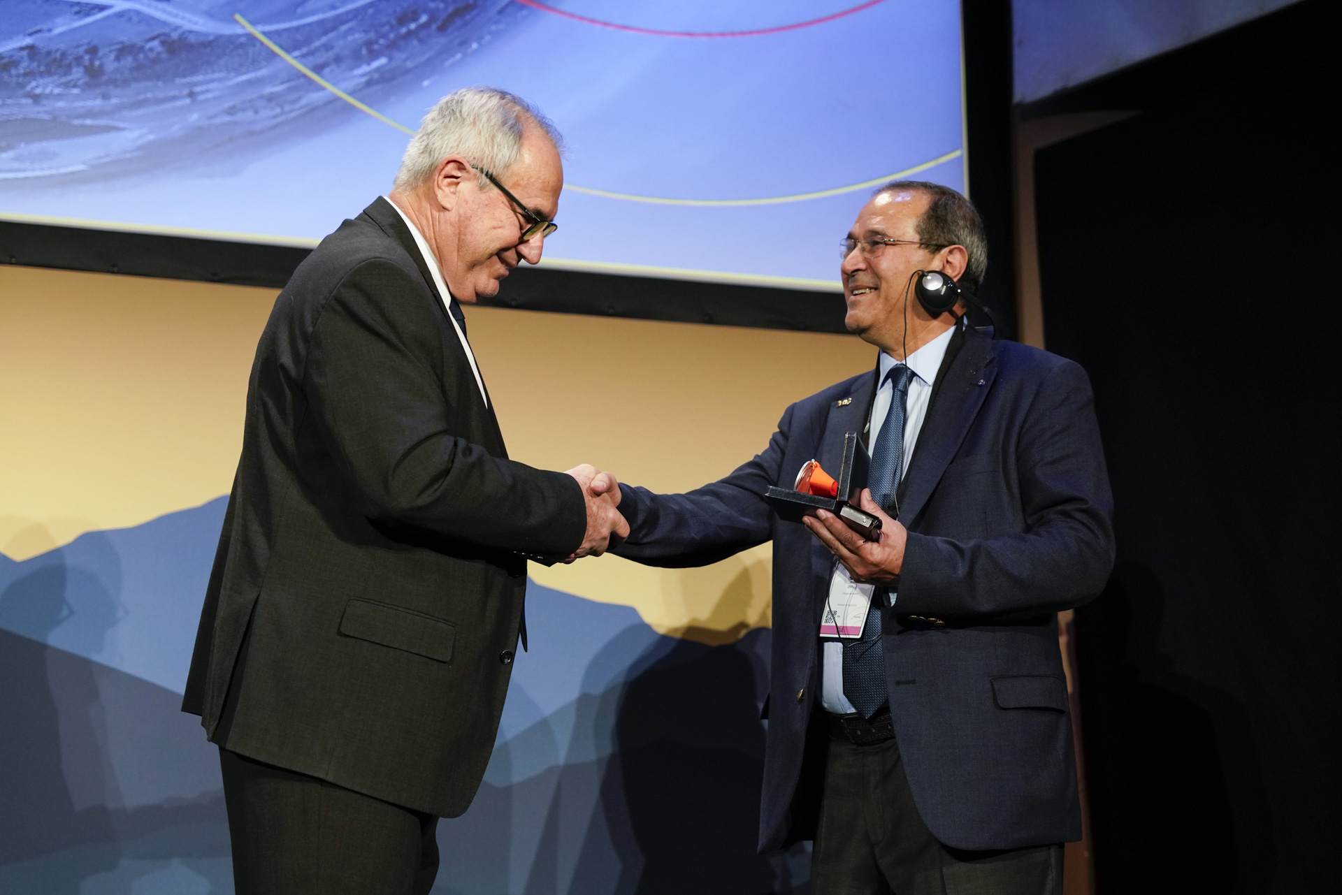 Dr Malek Zrelli, former Delegate and Regional Commission Vice-President, representing Tunisia (right) receiving the meritorious award from the President of the WOAH World Assembly, Dr. Hugo Federico Idoyaga Benítez. Picture (c) M. Tric (woah) 2024.