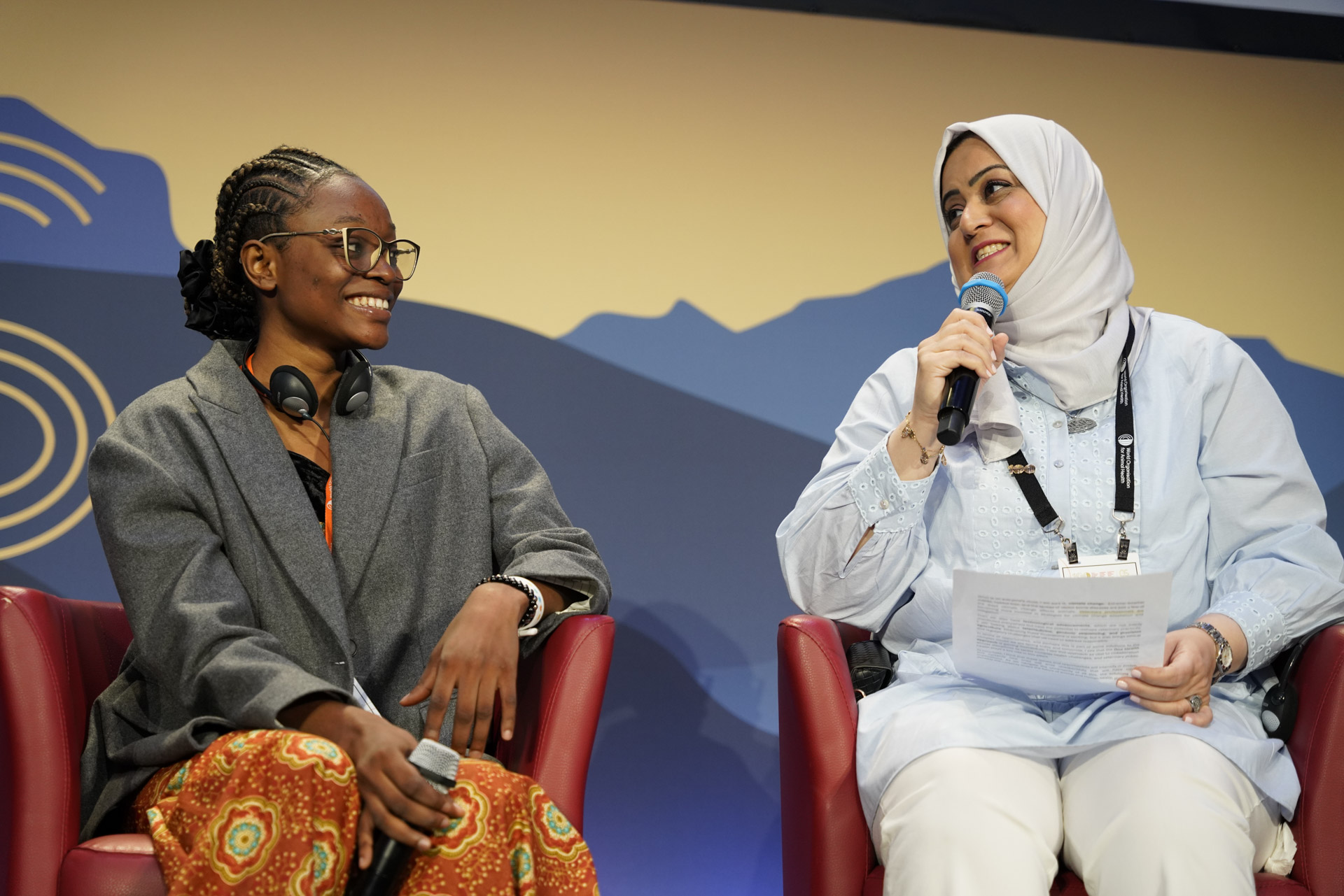 Panel discussion on the future of WOAH. Left : Ms. Christiana Ololade Olajimbiti (Animal Welfare Chair of the IVSA). Right : Dr. Fajer Sabah Al Salloom (Delegate of Bahrein and Vice-President of the WOAH Council). Picture (c) M. Tric (woah) 2024