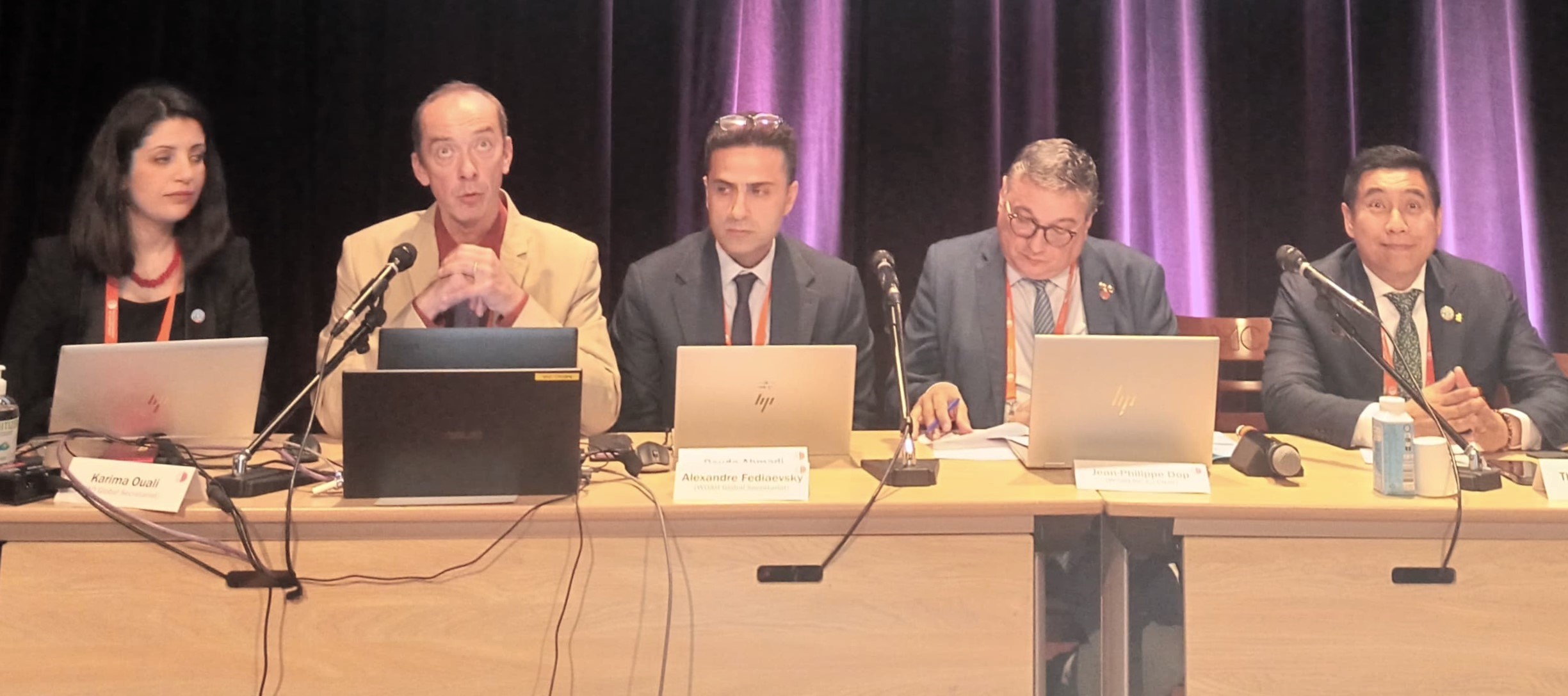 Fltr : Karima Ouali (FAO), Alexandre Fediaevsky (WOAH), Bouda Ahmadi (FAO), Jean-Philippe Dop (WOAH) Thanawat Tiensin (FAO). Picture © M. Sirdar (woah) 2024.