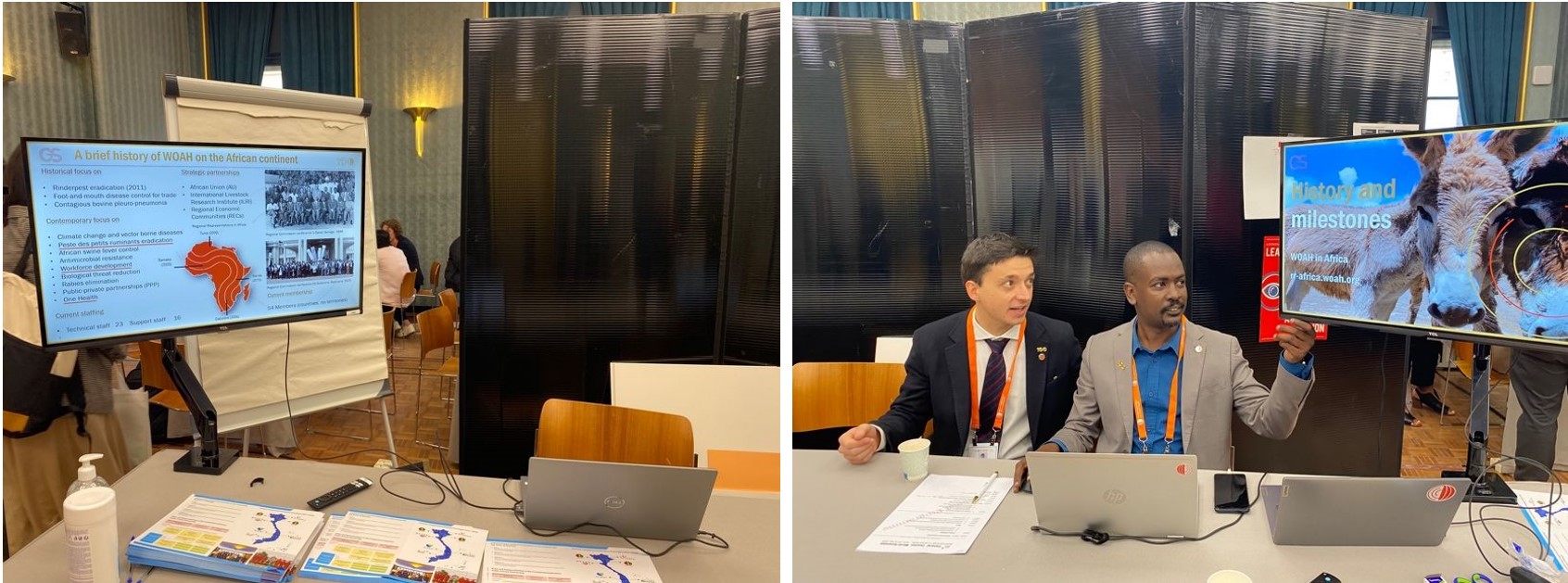 Drs Francesco Valentini (WOAH Tunis) and Mohamed Sirdar (WOAH Gaborone) manning the Africa Regional Kiosk on Monday 27 May. Picture (c) Melis Nurkan (woah) 2024.