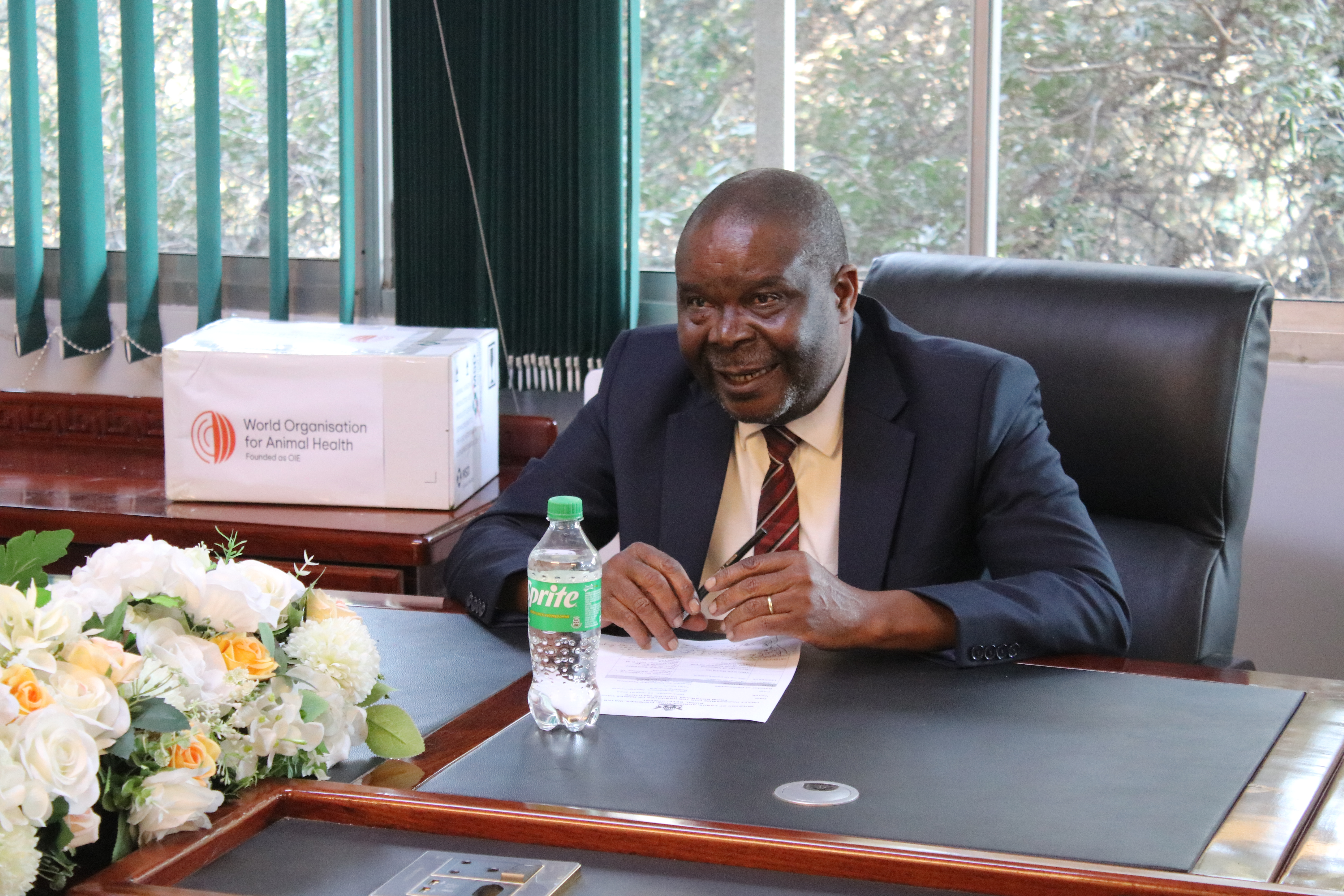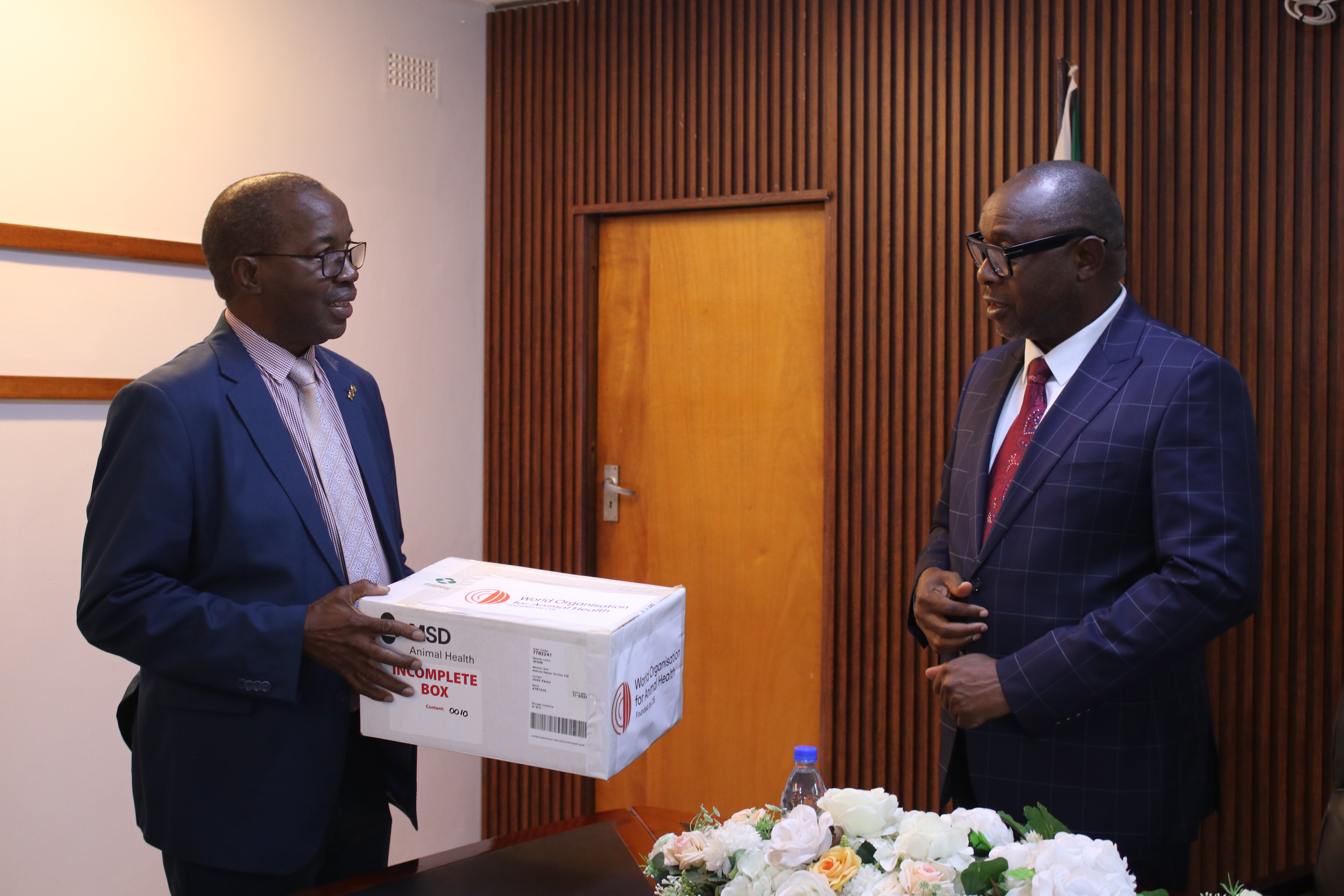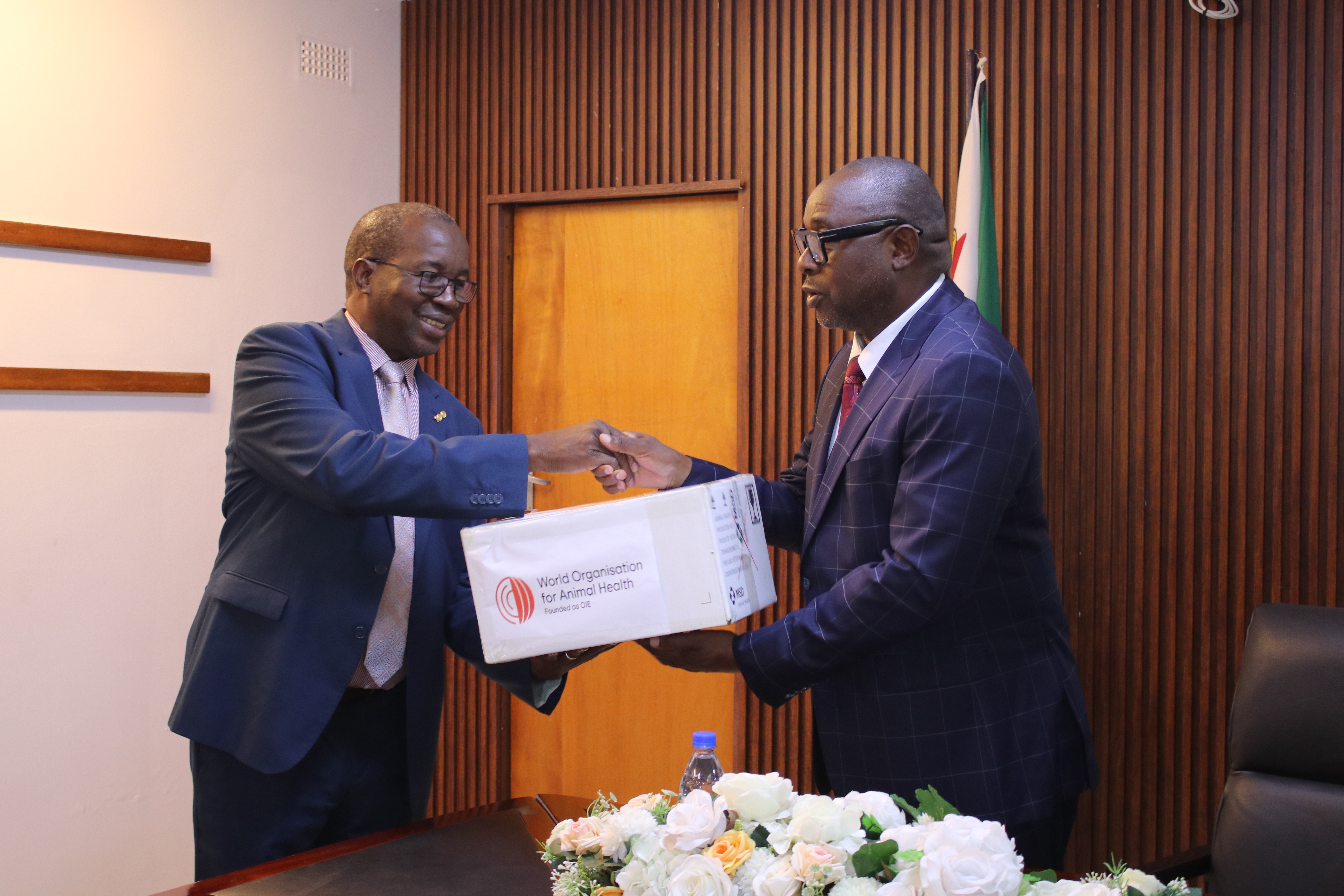 Dr. Moetapele Letshwenyo, WOAH Sub-Regional Representative for Southern Africa (left) handing over the vaccines to Hon. Davis Marapira ,Deputy Minister, Ministry of Lands, Agriculture, Fisheries, and Rural Development in Harare Zimbabwe. Picture (c) P. Bastiaensen (woah) 2025.