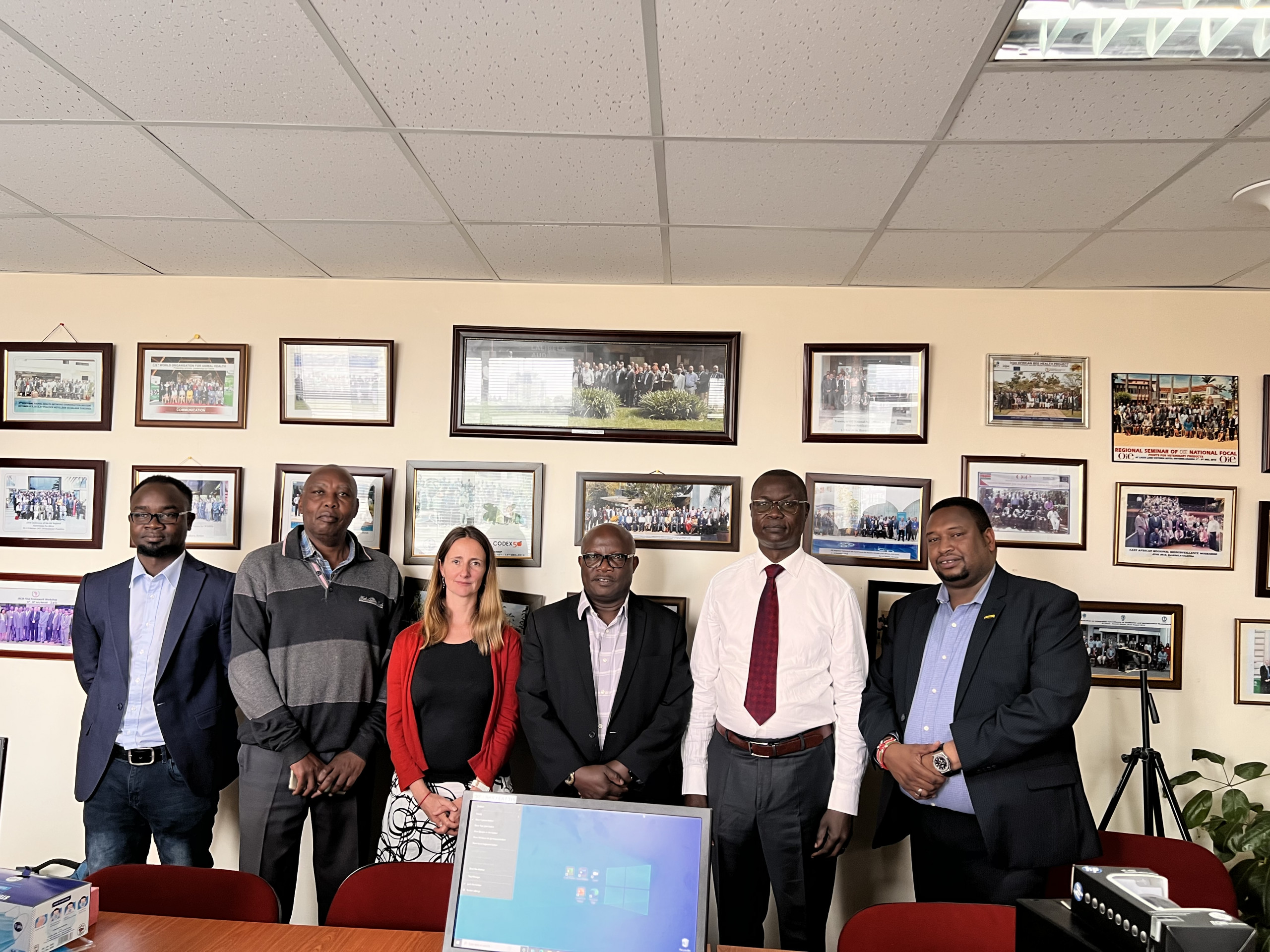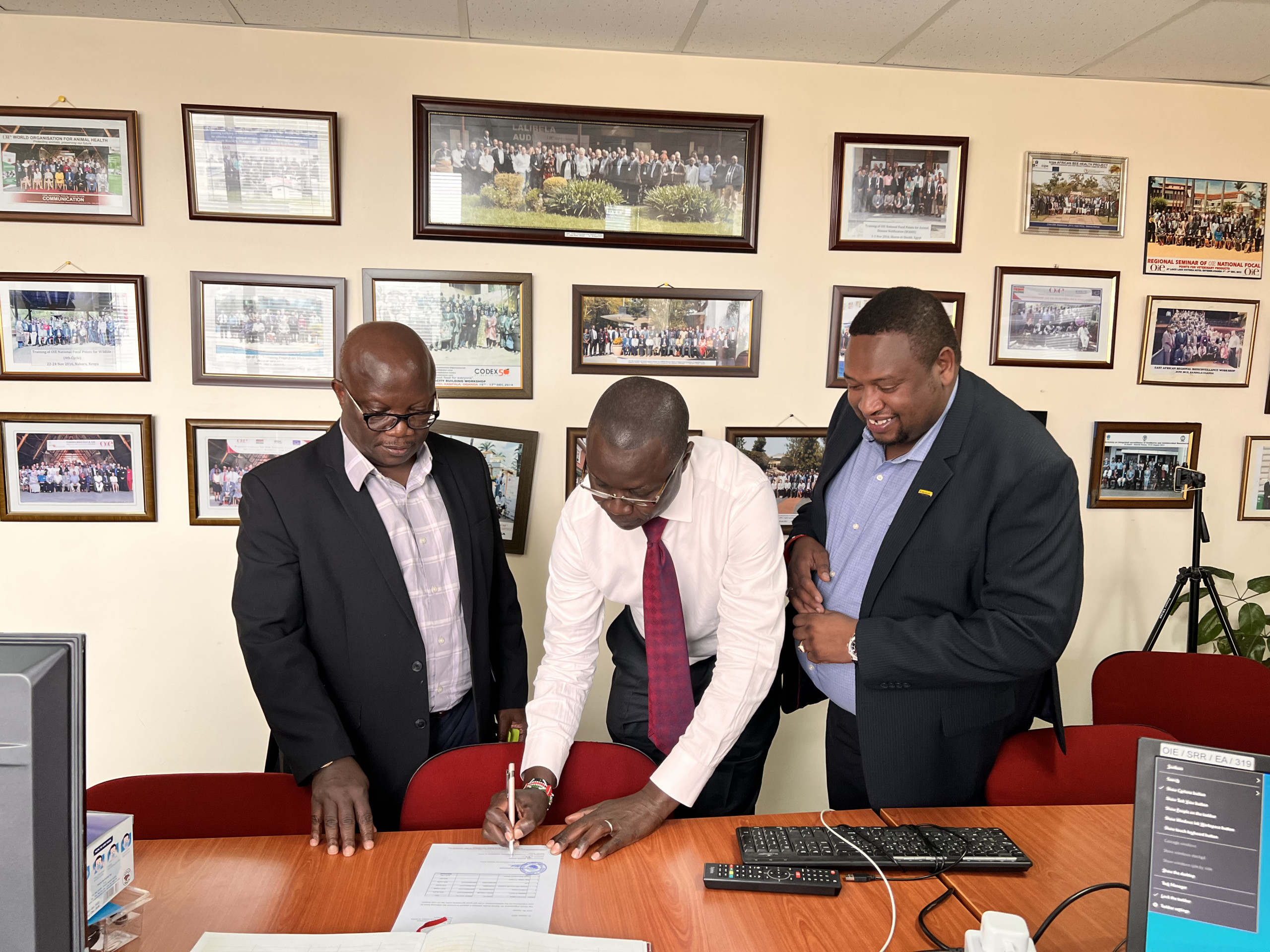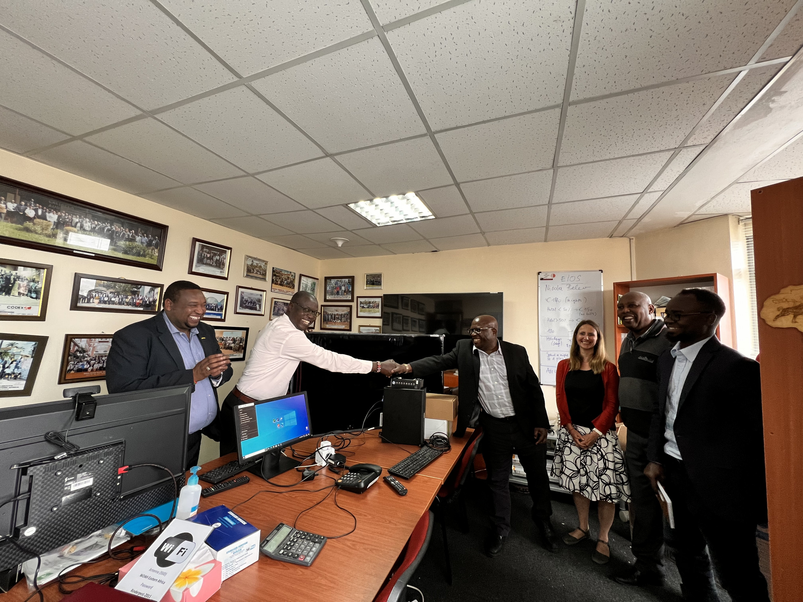 Dr. Samuel Wakhusama leading the WOAH team in handing over facilites to Mr. Benson Ameda President of AVTA at WOAH sub regional offices in Nairobi. Picture (c) L. Iyadi (WOAH ) 2022.