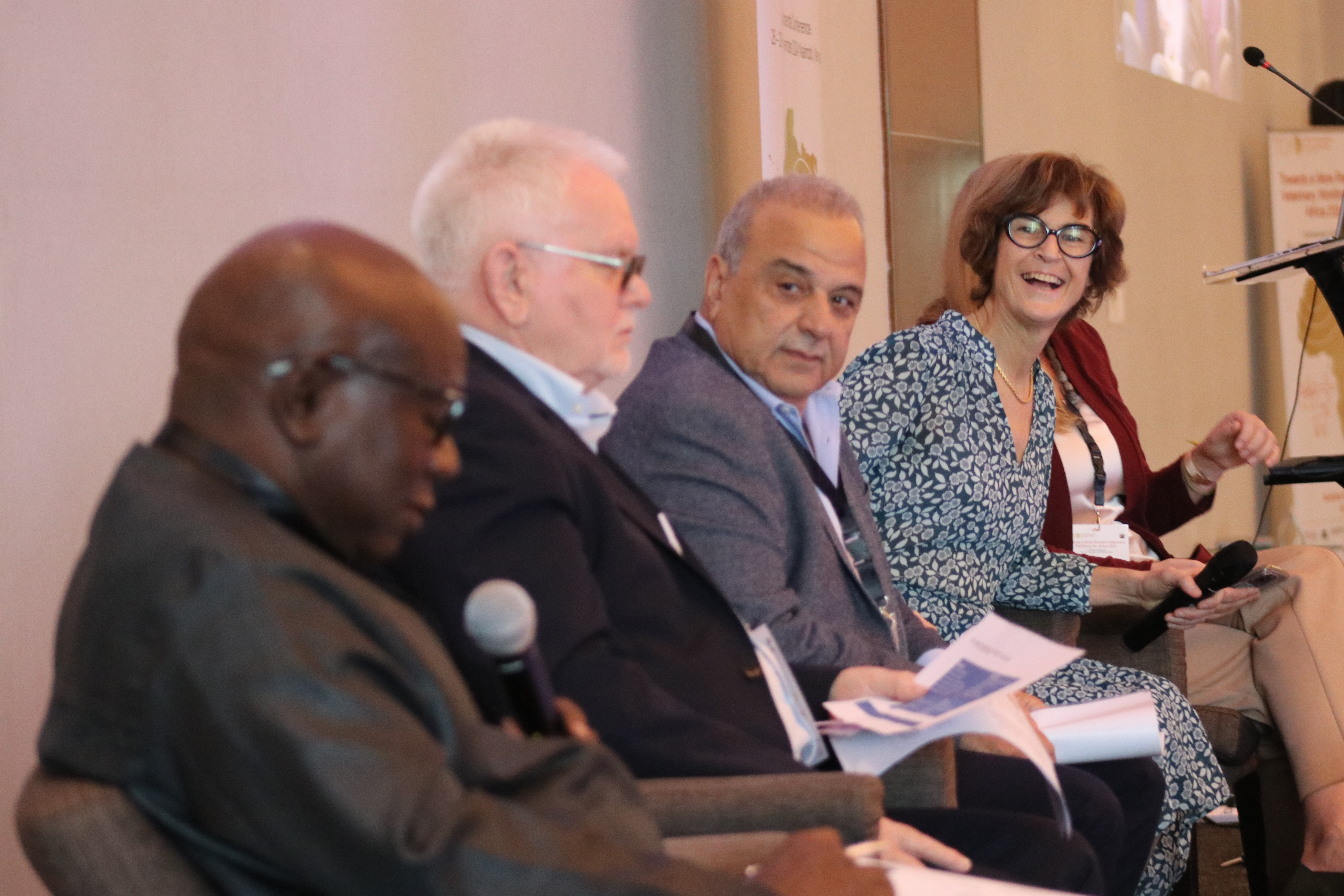 Fltr : Panellists Bouna Diop, Andy Peters, Khalid Omari Tadloui, Isabelle Dieuzy - Labaye and Shannon Mesenhowski (not visible) at the launch of the Africa PPP Forum in the Veterinary Domain in Nairobi, in November 2024. Picture (c) P. Bastiaensen (woah) 2024.