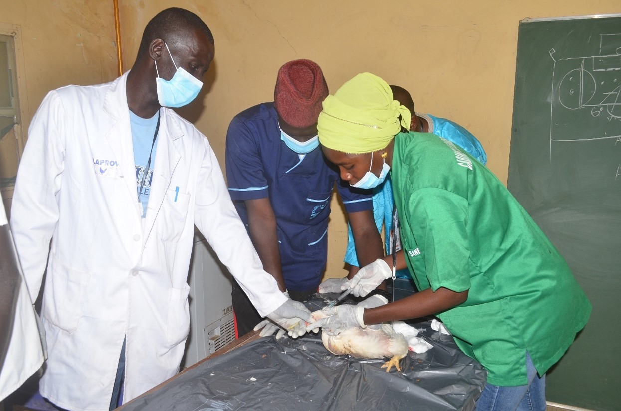 For initial training, the project works with five national training institutions for veterinary paraprofessionals (VPPs) in the two countries. With various stakeholders, the Organisation is working to revise training curriculae, and supports practical and clinical training in the institutions. The project also aims to develop the capacities of existing – practising – VPPs through continuous training. To achieve this, a study of training needs carried out by the project identified veterinary legislation and regulations, and good veterinary diagnostic and therapeutic practices as priority topics. For the implementation of these training courses and mainly to ensure their sustainability, two national trainers have been designated in each country by the respective WOAH Delegates. This will ensure the implementation of the training in their respective countries for each of these topics. For the topic focused on good veterinary diagnostic and therapeutic practices, the four trainers chosen by WOAH Delegates were trained in October 2022 at the Ecole Inter-Etats des Sciences et Médecine Vétérinaire de Dakar (EISMV), a project partner. This training enabled them to strengthen their skills on this topic and especially in andragogy to facilitate the implementation of the training.