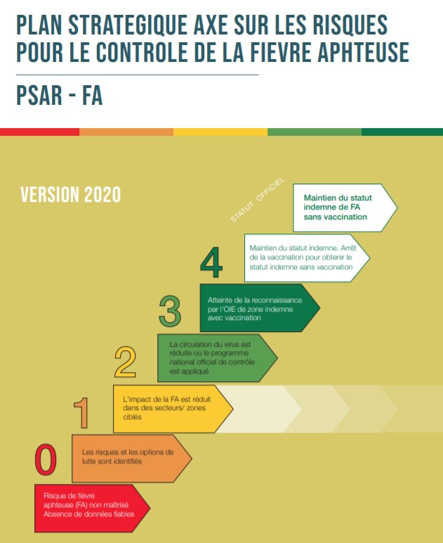 Les participants ont été interrogés sur la nouvelle version de l’outil SAT. En outre, les participants ont été informés de l’existence du Groupe consultatif régional (Regional Advisory Group) sur la fièvre aphteuse pour les différentes régions d’Afrique. L’ordre du jour de l’atelier prévoyait également un travail de groupe sur l’élaboration de plans d’évaluation des risques et de plans stratégiques axés sur les risques (Risk-based strategic plans, ou RBSP) en matière de fièvre aphteuse.