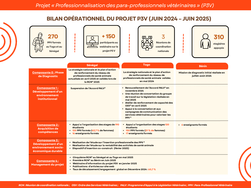 Les cinquièmes réunions nationales de coordination du projet P3V ont marqué une étape stratégique importante. Elles ont renforcé la transparence, valorisé les résultats et encouragé une vision commune du projet. Les échanges ont permis de faire le point sur les avancées nationales, d’identifier des défis communs et de réfléchir à des solutions durables, notamment par l’innovation numérique. La mobilisation des acteurs autour de la professionnalisation des PPV, du renforcement des services vétérinaires de proximité et des capacités locales a été saluée. Les recommandations issues de ces réunions poseront les bases des prochaines étapes, appelant à un engagement collectif pour améliorer les conditions d’exercice des PPV au service des éleveurs et de la santé animale en Afrique de l’Ouest.