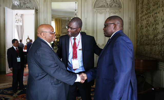 Le Docteur Mbargou Lô, Délégué de l’OIE au Sénégal, présente le Président de l’OIE et Délégué de l’Afrique du Sud, le Dr Botlhe Michael Modisane (à gauche) à l’Ambassadeur du Sénégal en France, S.E. Barissou Sené (à droite). Crédit photo © Maurine Tric (oie) 2018.