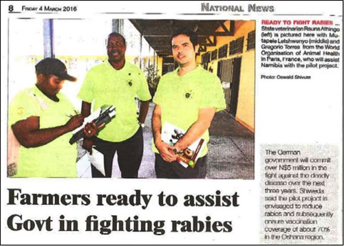 En mars 2015, le Gouvernement de la Namibie avait lancé sa Stratégie Nationale de Lutte contre la Rage dans le but d’éliminer les mortalités humaines causées par la rage grâce à un contrôle efficace de la rage canine .Le Gouvernement de la République Fédérale d’Allemagne a exprimé son intérêt à soutenir la lutte contre la rage canine en Afrique australe, la Namibie étant le premier pays à bénéficier de cette aide.