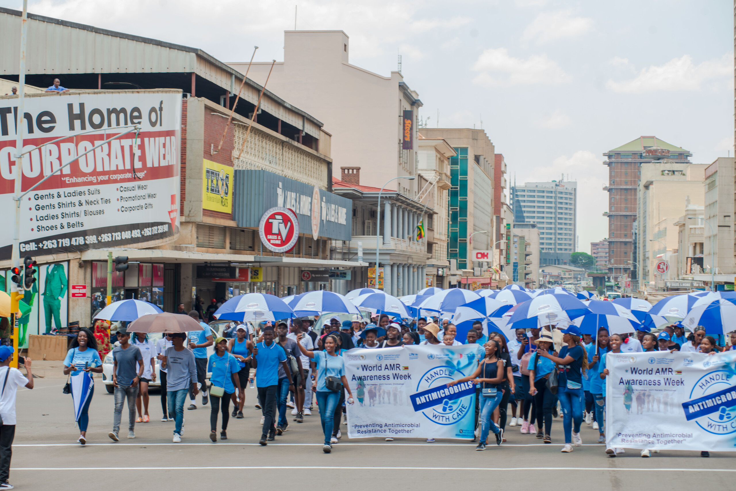 La 5ème Semaine mondiale de sensibilisation à la résistance aux antimicrobiens pour l’Afrique s’est achevée sur une note positive, en commençant par des visites de laboratoire dans les sections liées à la résistance aux antimicrobiens des unités de laboratoire des services vétérinaires (santé animale) et de l’hôpital central de Harare (santé humaine). Ces deux laboratoires sont les principaux laboratoires de référence pour la santé animale et humaine et ont été rénovés grâce à des fonds provenant du Projet du Fonds Fleming. Il était impressionnant de constater la modernisation des installations et l’utilisation d’équipements de pointe pour les tests de résistance aux antimicrobiens. Les visites des laboratoires ont été suivies d’une marche organisée par le Secrétariat national Une Seule Santé RAM,  en collaboration avec les étudiants de la Faculté de médecine de l’Université du Zimbabwe. La marche était d’environ 1,5 km, traversant le centre-ville commercial de Harare et se terminant sur le terrain de Unity Square Environ 500 personnes ont participé à la marche. Les marcheurs ont reçu des T-shirts, des casquettes, des parapluies et des sacs de la WAAW. La WAAW a été officiellement clôturée sur le terrain de Unity Square, avec les allocutions finales des représentants de la Quadripartite en Afrique, de l’UA, des étudiants et du Dr Pious Makaya au nom du Gouvernement du Zimbabwe.