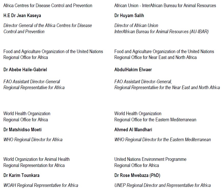 We, the African Leadership of Africa CDC, AU-IBAR, FAO, WOAH, WHO, and UNEP, commit to: