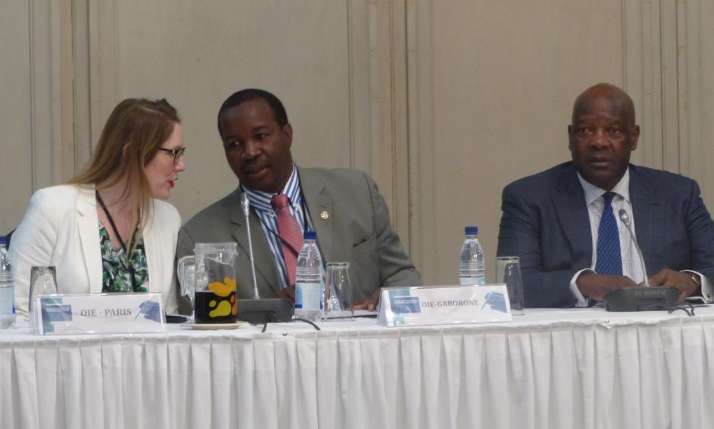 De gauche à droite : La Représentante du Service des Programmes de l’OIE, Jennifer Lasley, le Représentant Sous-régional de l’OIE pour l’Afrique australe, Moetapele Letshwenyo, et le Secrétaire d’Etat à l’Elevage du Ministère du Développement de l’Agriculture, de la Mécanisation et de l’Irrigation du Zimbabwe, Son Excellence P.T. Zhanda.