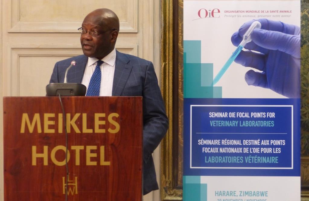 La cérémonie d’ouverture a été présidée par la Dre Unesu H. Ushewokunze – Obatolu, Déléguée OIE et Directrice de l’Elevage et des Services Vétérinaires du Zimbabwe, suivi du Secrétaire d’Etat pour l’Elevage du Ministère Zimbabwéen du Développement de l’Agriculture, de la Mécanisation et de l’Irrigation, S.E. Monsieur P.T. Zhanda, qui a prononcé une allocution d’ouverture, aux côtés de deux représentants de l’OIE, Moetapele Letshwenyo (OIE Gaborone) et Jennifer Lasley (OIE Paris).