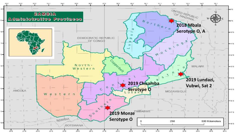 Distribution de cas de fièvre aphteuse en Zambie en 2018/19. Source: Secretariat de la SADC