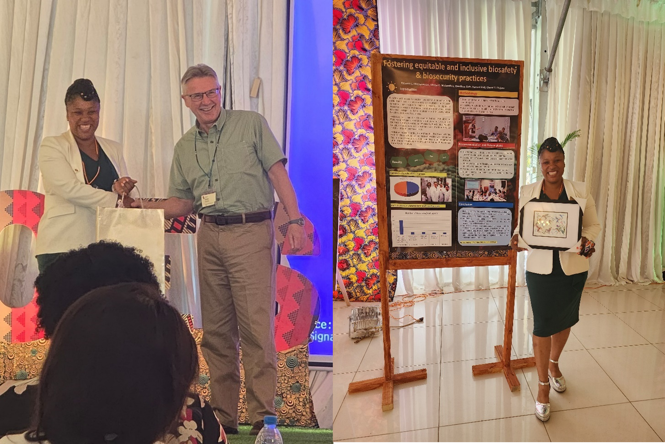 Photos de Mme Patience Mushanawani recevant son prix (à gauche) et debout à côté de son affiche gagnante (à droite) Photo © I. Busuulwa (omsa)