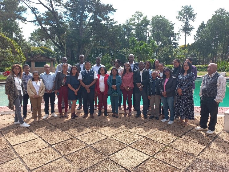 Members from the Quadripartite. Fltr : Falihery Razafindrabe (WHO-Madagascar); Dr. Irène Ouoba (AMR Regional Coordinator, FAO AMR Focal Point for Sub-Saharan Africa); Dr. Walter Fuller (AMR Technical Officer, WHO AFRO); Dr. Mohamed Sirdar (WOAH Sub-Regional Representation for Southern Africa); Dr. Ilo Tsimok’Haja Ramahatafandry (DVS); Dr. Mark Obonyo (AMR Coordinator and One Health Focal Point, FAO Sub-Regional Office for Southern Africa); Dr Jobert Tchuidjang (FAO). Picture (c) M.Sirdar (woah) 2023.