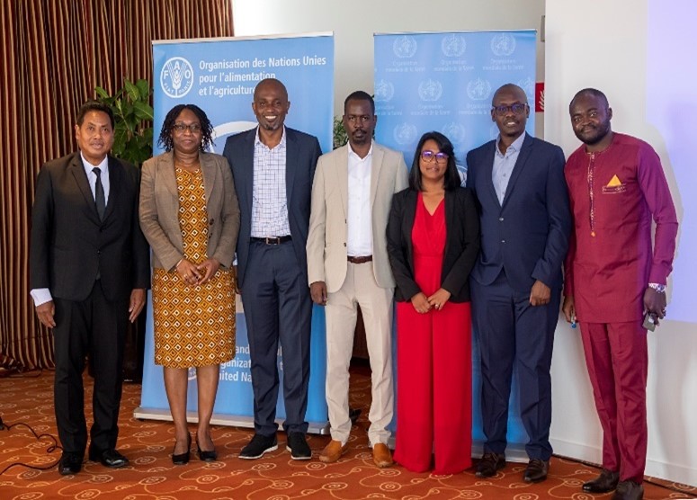Membres de la Quadripartite. De gauche à droite : Dr Falihery Razafindrabe (OMS, Madagascar) ; Dre. Irène Ouoba (Coordinatrice régionale AMR, Point focal AMR de la FAO pour l’Afrique sub-saharienne) ; Dr. Walter Fuller (Responsable technique AMR-OMS AFRO) ; Dr. Mohamed Sirdar (Représentation sous-régionale de l’OMS pour l’Afrique australe) ; Dre. Ilo Tsimok’Haja Ramahatafandry (DSV) ; Dr. Mark Obonyo (Coordinateur AMR et point focal One Health, bureau sous-régional de la FAO pour l’Afrique australe) ; et Dr Jobert Tchuidjang (FAO) Photo (c) M.Sirdar (omsa) 2023.