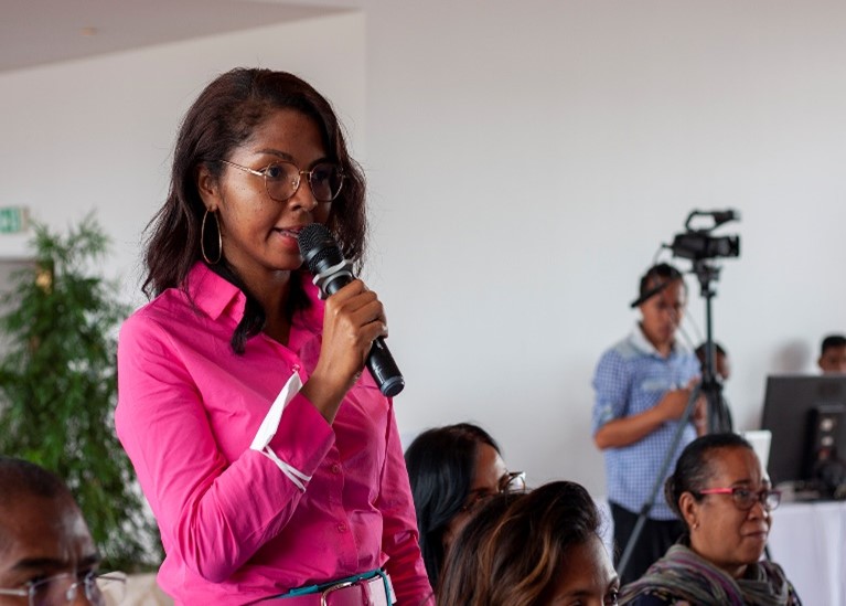Dr. Volatiana Andriananja, from the Society of Infectious Pathologies of Madagascar (SPIM), during the Q&A session at the workshop. Picture (c) M.Sirdar (woah) 2023.
