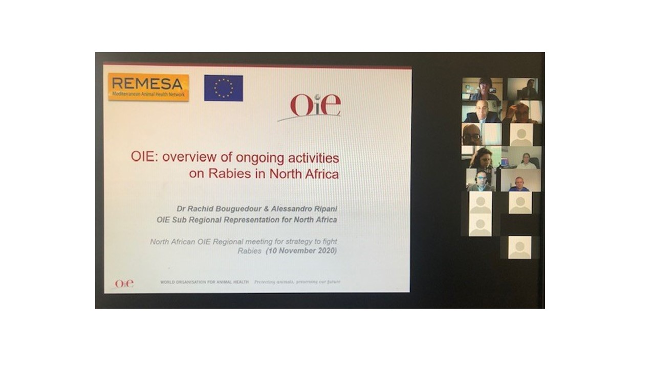 Dans le cadre du REMESA, la Représentation Sous-régionale de l’OIE pour l’Afrique du Nord a organisé le 10 novembre 2020 une réunion régionale pour l’Afrique du Nord dédiée à la stratégie de lutte contre la rage. Près de 40 participants étaient présents. Le but de la réunion était de faire le point sur les activités menées dans la sous-région afin de créer des synergies et de proposer de nouveaux projets susceptibles d’avoir un impact sur le terrain en fonction des attentes des pays.