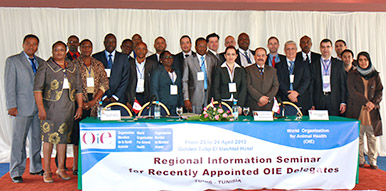 Les Délégués OIE récemment nommés de 16 pays membres de l’OIE en Afrique se sont réunis à Tunis les 23 et 24 avril 2013 pour un séminaire régional d’information ayant entre autre pour objectif de présenter les concepts de bonne gouvernance pour faire progresser la santé animale et la sécurité sanitaire des produits d’origine animale au niveau national. Cette réunion a également permis d’expliquer et de clarifier les rôles et responsabilités des Délégués et points focaux de l’OIE.