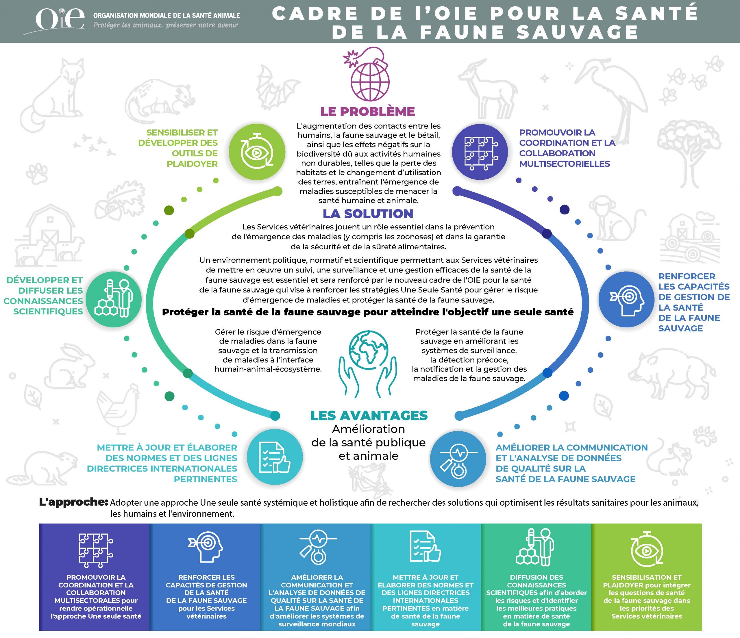 Les interactions entre la faune sauvage et le bétail peuvent entraîner une transmission bidirectionnelle des maladies. De nombreuses maladies affectant à la fois le bétail et les populations d’animaux sauvages constituent une grave menace pour les espèces sauvages menacées et les races de bétail indigènes. Les maladies de la faune sauvage peuvent donc avoir un impact sérieux sur la santé animale et publique et peuvent nuire à la conservation de la faune sauvage. La surveillance des maladies chez les animaux sauvages doit être considérée comme aussi importante que celle des maladies des animaux domestiques.