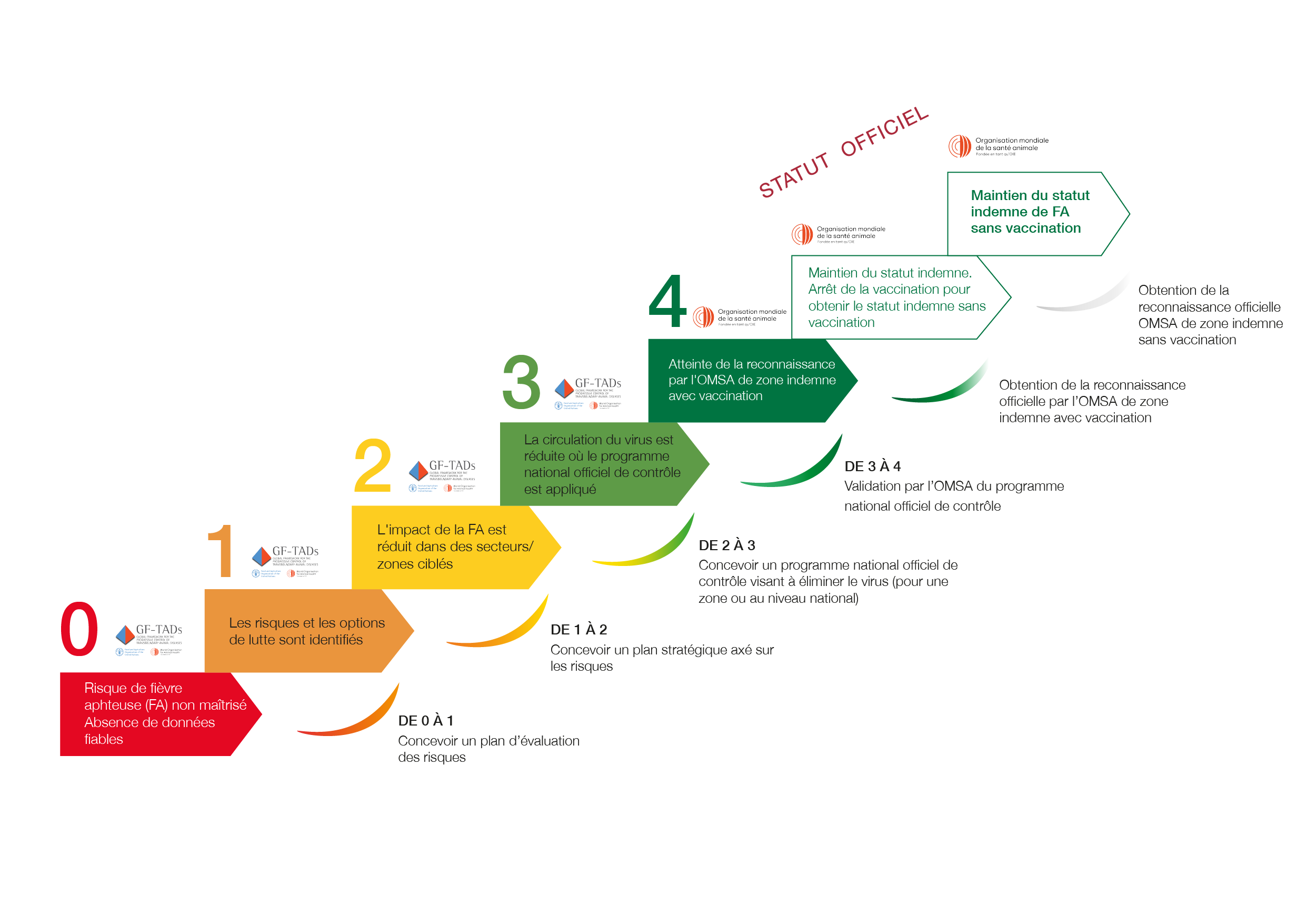 Le pays commence par acquérir une meilleure connaissance épidémiologique de la fièvre aphteuse (stade 1), met progressivement en œuvre des mesures de lutte fondées sur le risque (stade 2), avant de passer au stade 3, à l’issue duquel le pays peut demander l’approbation par l’OMSA de son programme officiel de lutte contre la fièvre aphteuse visant à éliminer la circulation du virus de la fièvre aphteuse (stade 4). Les étapes supérieures correspondent au pays finalement reconnu par l’OMSA comme étant indemne de fièvre aphteuse avec ou sans vaccination.