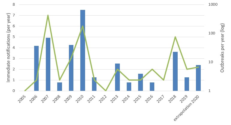 Figure: Nombre annuel de notifications immédiates (ligne verte) et nombre de foyers (barres bleues) signalés à l’OIE (OMSA) entre 2005 et 2020 (WAHIS, mai 2020)