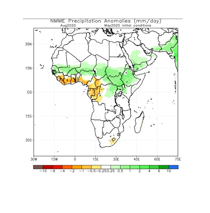 Carte: Prédictions des anomalies de précipitations (mm/jour) pour aout 2020 ( NMME, FAO/ICPALD, mai 2020)